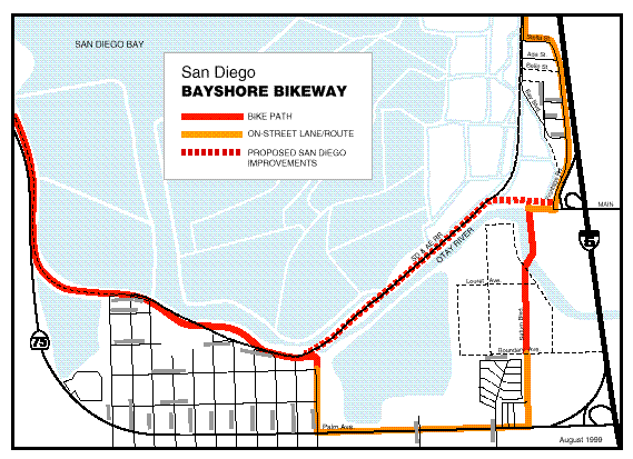 The original bikeway plan identified interim facilities on local streets for portions of the route. Two of these "interim" facilities still in place today are at the south end of the Bay between Imperial Beach and Chula Vista, and across the Sweetwater River. Replacing these routings has been the main focus of the Bayshore Bikeway Committee.